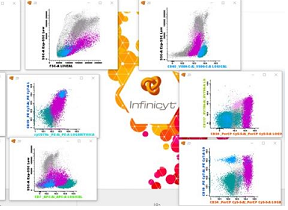 Paral·lelament, utilitzem el software d’anàlisi InfinicytTM, eina patentada pel Consistori Euroflow que ens permet una anàlisi multiparamètrica de milions de dades complexes que contenen els arxius generats pels citòmetres.A través de marcadors comuns en els diferents panells de tinció de les cèl·lules d’interès s’obté un anàlisi global del panell en qüestió amb un immunofenotip complet de les poblacions cel·lulars estudiades.Aquest mecanisme d’anàlisi cel·lular permet millorar el diagnòstic, el tractament i la monitorització de leucèmies, limfomes i mielomes, a més d’altres patologies.