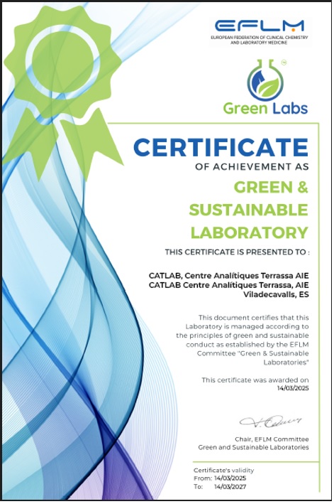 CATLAB disposa d'un sistema de Gestió Ambiental conforme amb la Norma ISO 14001 per a tota la seva activitat al Laboratori Central de Viladecavalls. CATLAB està compromès a promoure les bones pràctiques ambientals, a gestionar el consum de recursos i a mitigar l’impacte ambiental derivat de la seva activitat. Catlab disposa també de la certificació de Laboratori Verd i Sostenible “Green & Sustainable Laboratories” que promou la European Federation of Clinical Chemistry and Laboratory Medicine (EFLM).